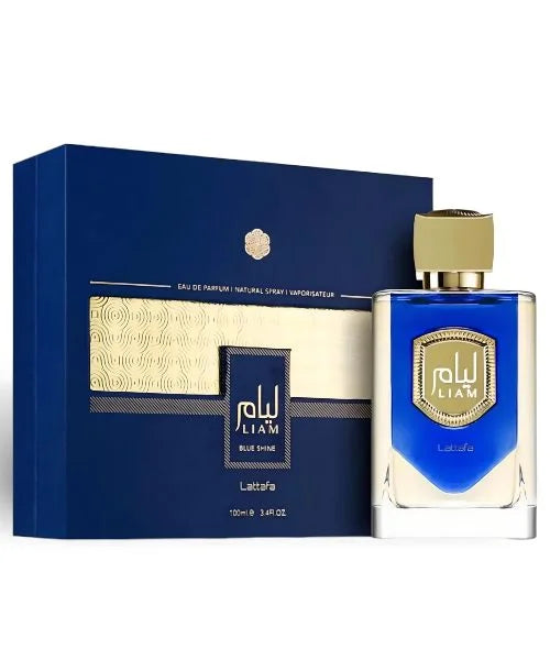 Liam Blue Shine By Lattafa, launched in 2023. Top notes are Bergamot, Rosemary and Pepper; middle notes are Sea Notes and Violet; base notes are Musk, Amber and Patchouli.